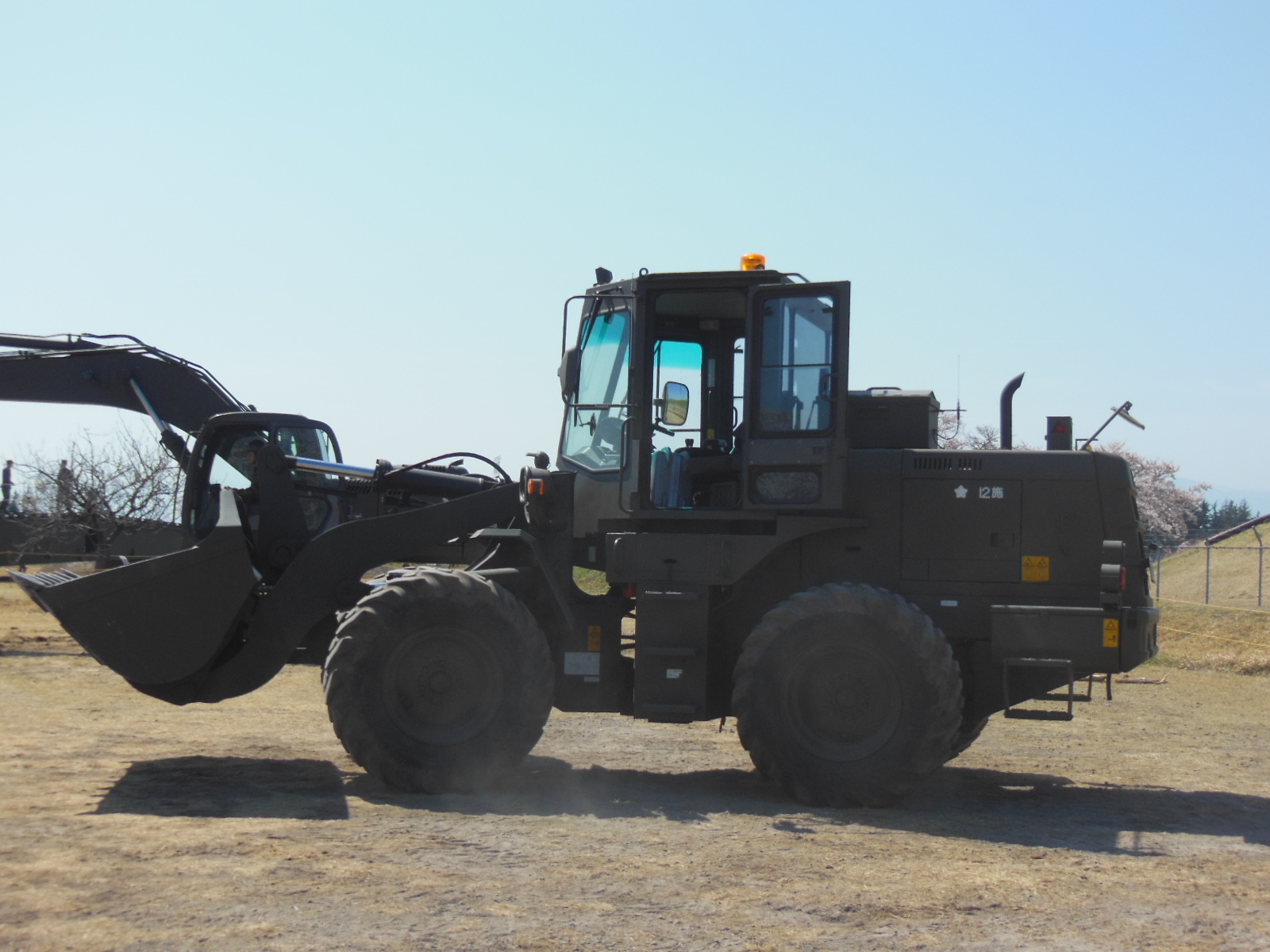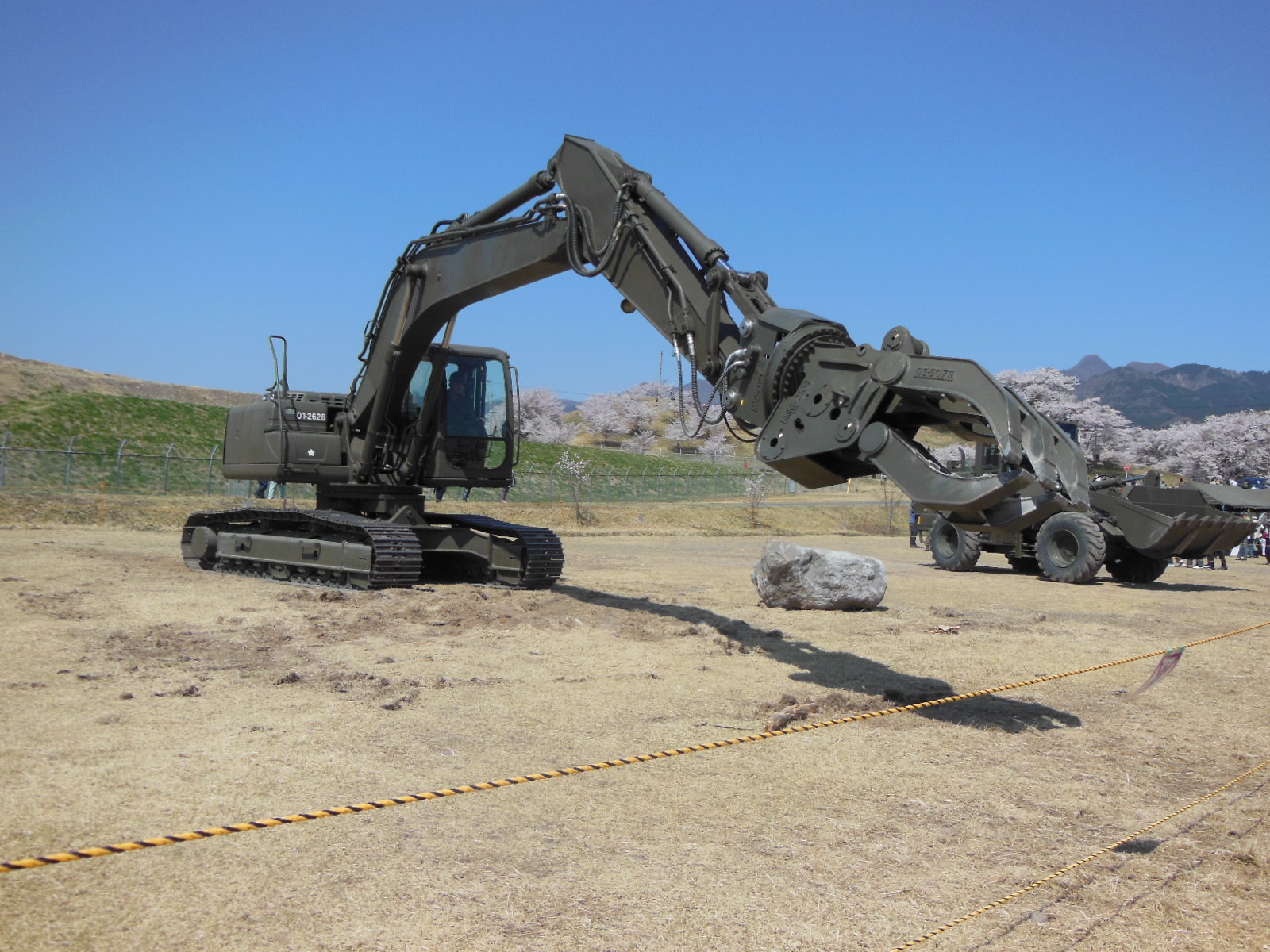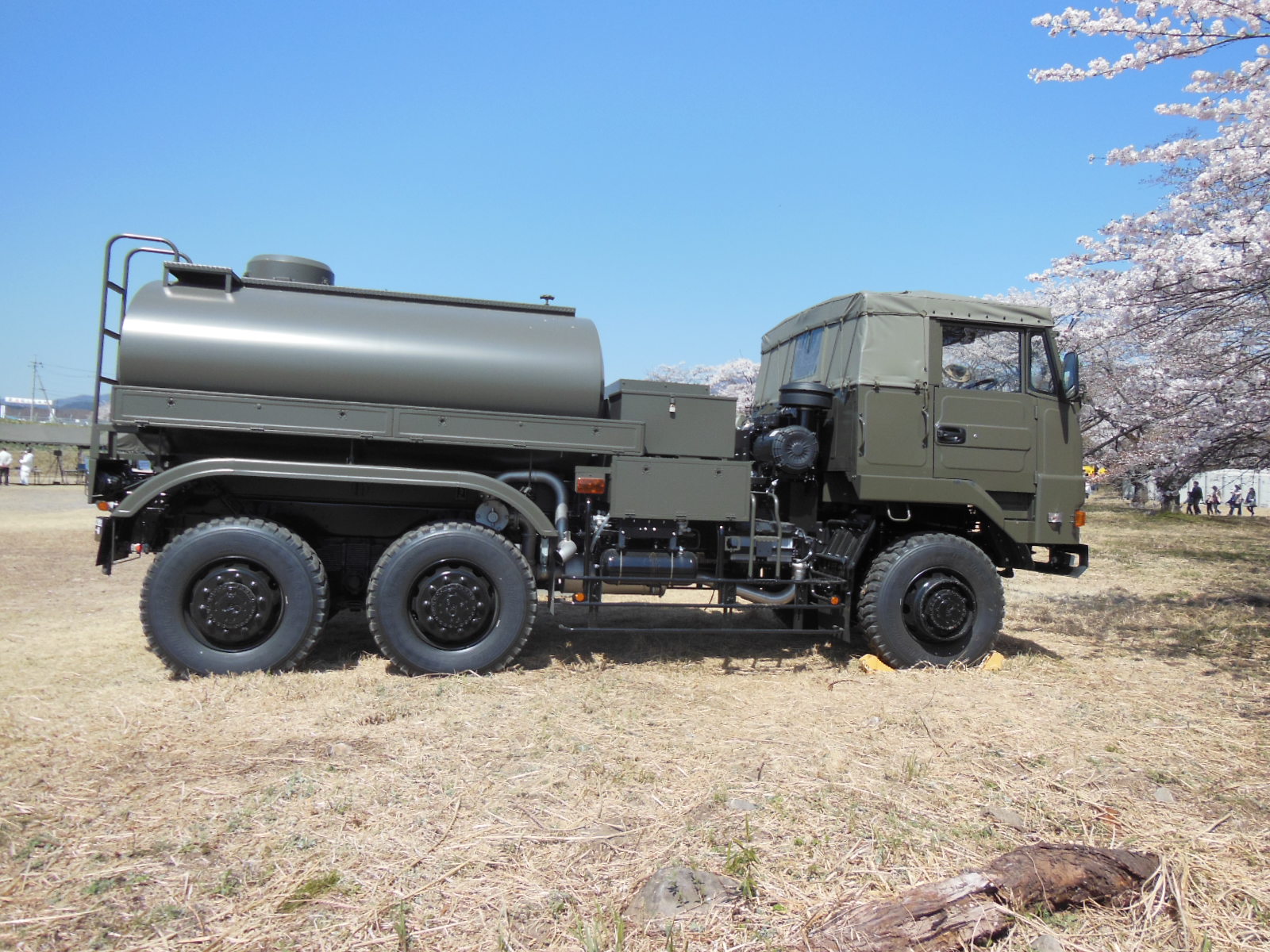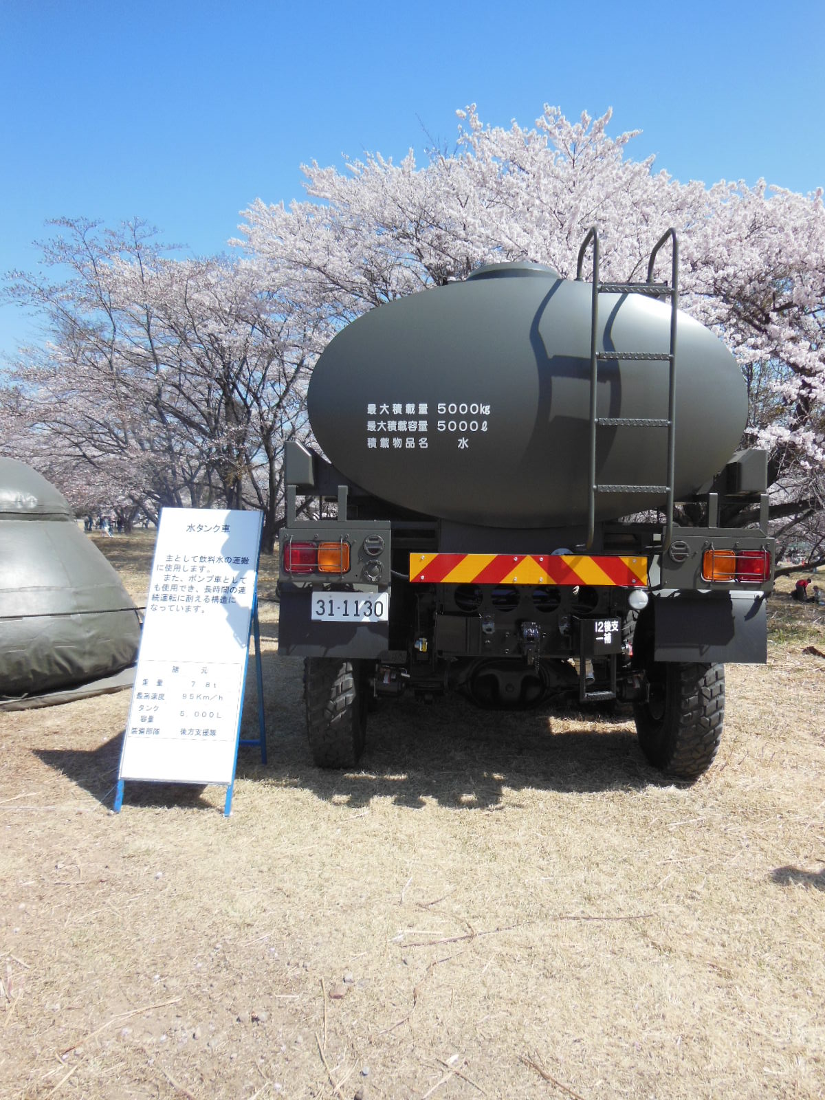 ↑スキあらば便利グッズがくっついている自衛隊車両。これ一台にスコップ・手斧・組み立て式つるはし・袋槍(まさかですが、それっぽいもの)・ロープを発見しました。