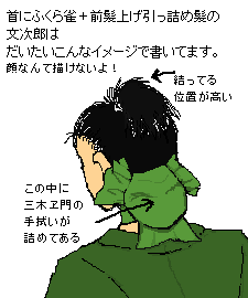最初に文次郎の首に頭巾を蝶結びしたのは仙蔵で、装束の一環として結んで垂らせばいいだけのものを、無意味にデコラティブにして文次郎に嫌がられました。
