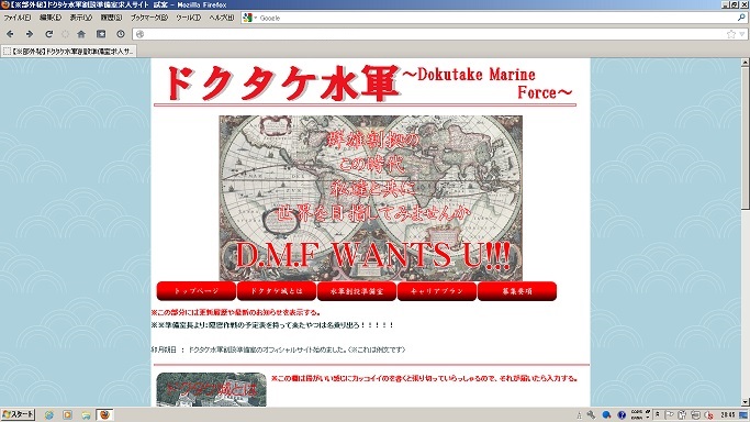「ドクタケ水軍創設準備室が求人開始にあたってオフィシャルサイトを作っている最中に、うっかり中途半端なデータをサーバに上げちゃった」体で、↑のようなトップページに変更していました。パズルゲームのページや、オンマウスで文字が炎を吹くエフェクトに気づいた方はどれくらいいらっしゃったんでしょう……。がんがってJava書いたよCSS組んだよ……。